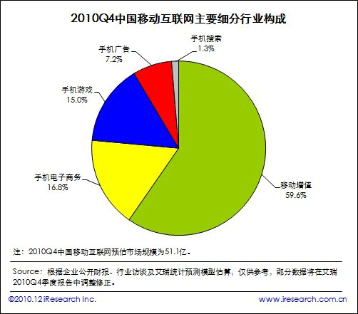 根據(jù)艾瑞咨詢即將發(fā)布的2010年第四季度中國移動互聯(lián)網(wǎng)市場監(jiān)測數(shù)據(jù)顯示,2010Q4中國移動互聯(lián)網(wǎng)市場整體規(guī)模達到51.1億,同比增長19.8%,環(huán)比增長20.3%。艾瑞咨詢分析認為,本季度電信運營商對計費通道治理開始收尾,移動增值市場整體復蘇。同時手機電子商務、手機游戲業(yè)務領域取得良好市場表現(xiàn),受手機應用商店、位置簽到服務等新型手機業(yè)務創(chuàng)新的帶動,移動互聯(lián)網(wǎng)規(guī)?傮w攀升,投融資比重增加。