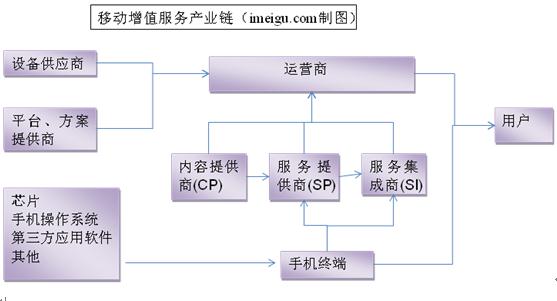 中國電信,中國移動(dòng),中國聯(lián)通是中國的三大電信運(yùn)營(yíng)商。移動(dòng)增值服務(wù)和移動(dòng)支付解決方案已構(gòu)成了移動(dòng)運(yùn)營(yíng)商的兩大收入來源。移動(dòng)增值業(yè)務(wù)是包括所有增進(jìn)移動(dòng)用戶體驗(yàn)的非話音服務(wù),在中國目前主要的四大移動(dòng)增值業(yè)務(wù)是:短信、彩信、WAP和彩鈴業(yè)務(wù)。移動(dòng)增值業(yè)務(wù)的產(chǎn)業(yè)鏈如下圖所示:
