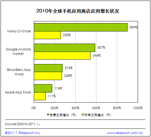 iResearch艾瑞咨詢整理Distimo最新公布數(shù)據(jù)發(fā)現(xiàn),2010年全球手機(jī)應(yīng)用商店免費(fèi)應(yīng)用大幅增長(zhǎng)。數(shù)據(jù)表明,諾基亞Ovi Store免費(fèi)應(yīng)用增長(zhǎng)速度最快,增長(zhǎng)率為899%,谷歌Android Market和RIM的BlackBerry App World次之,增長(zhǎng)率分別為587%和274%.