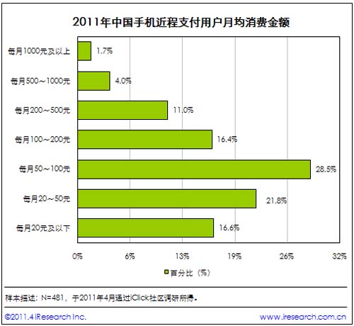 根據艾瑞咨詢近期發(fā)布的《2011年中國新興線下支付行業(yè)研究報告》的研究數據顯示,中國手機支付發(fā)生的場景主要集中在超市、便利店和商場等場所;并且,目前的中國用戶的手機支付金額,都以100元及以下的小額支付為主。