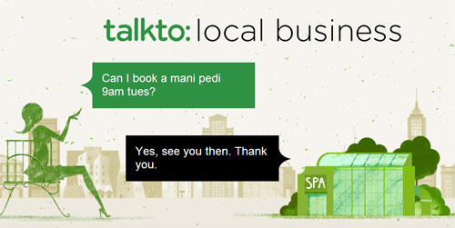 這一切是怎樣實(shí)現(xiàn)的呢?TalkTo通過短信與商家溝通。用戶可以通過web應(yīng)用在TalkTo目錄中搜索需要的服務(wù),輸入商家的詳細(xì)地址或者大概位置,TalkTo就可以確保商家看到用戶的短信。TalkTo用戶可以向商家提出問題和意見,或直接預(yù)定服務(wù)!斑@一切就像和朋友發(fā)短信一樣簡(jiǎn)單!