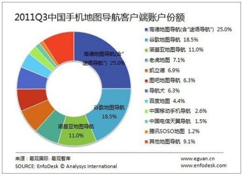 谷歌:以18.5%的綜合份額占據(jù)中國(guó)手機(jī)地圖導(dǎo)航客戶端市場(chǎng)排名次席。其中,谷歌地圖仍舊以27%的份額占據(jù)手機(jī)地圖客戶端市場(chǎng)第一的位置,但因?yàn)槠浣?jīng)營(yíng)策略和中國(guó)國(guó)內(nèi)政策等原因,谷歌地圖在內(nèi)地行貨版安卓手機(jī)中普遍被閹割,在一定程度上影響了谷歌地圖市場(chǎng)占有率的進(jìn)? 徊教嶸A磽,业娇N氈樵げ餛還雜惺只贗疾方魑筆旨隊(duì)τ迷趇Phone5中推出,這有可能撼動(dòng)谷歌地圖在IOS平臺(tái)的統(tǒng)治地位。