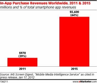 圖:IHS Screen Digest預(yù)計(jì)2015年應(yīng)用內(nèi)置支付將占據(jù)智能手機(jī)應(yīng)用營收總額的64%