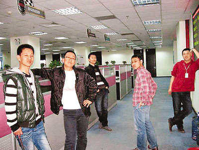 圖:李明磊(左一)與同事們堅守在呼叫中心的崗位上 想多賺錢助姐結(jié)婚