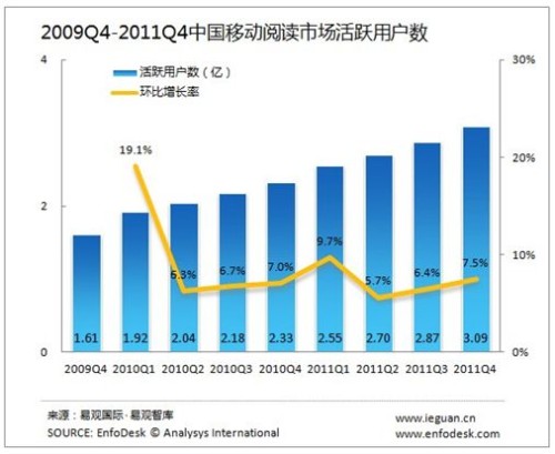 據(jù)EnfoDesk易觀智庫最新數(shù)據(jù)顯示,2011年第4季度中國手機(jī)閱讀市場(chǎng)活躍用戶數(shù)達(dá)3.09億,環(huán)比增長7.46%,同比增長33%。