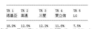 第一階段;湯森路透將每一項專利同歐洲電信標準協(xié)會截至2011年11月18日的LTE規(guī)范進行比較,確定專利的重要性。第二階段涉及先有技術檢查,即審查在美國和歐洲申請專利過程中的先有技術參考文獻。湯森路透利用先有技術參考文獻評估每項專利的新穎性并給出新穎性評級。湯森路透發(fā)現(xiàn),擁有屬于LTE標準范疇的基本與新穎專利的領先廠商有諾基亞、高通、三星、愛立信和LG。結果如下: