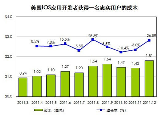 國際著名APP市場營銷組織Fiksu最新的研究數(shù)據(jù)或許能出答案。2011年12月iOS應(yīng)用開發(fā)者獲得一名忠實用戶的成本達到1.81美元,創(chuàng)下歷史新高。而在2011年第一季度,獲得一名用戶的平均成本為0.94美元,一年間單個用戶成本翻了一倍。當用戶對蘋果商店里花樣繁多的游戲開始麻木,就需要借助有針對性的推廣策略和強大的執(zhí)行,讓產(chǎn)品脫穎而出。如今忠實用戶成本的提高,使得幾乎所有開發(fā)者乃至小團隊都畏懼前期的市場推廣,大中型開發(fā)公司可利用自身的資源循環(huán)造血拉動用戶,越是小的開發(fā)團隊成功的幾率就越渺茫,而被吞并的可能性則大增。
