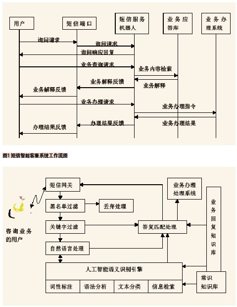 人工智能技術的引入讓機器能替代人工服務為用戶提出的問題和請求做出類人的處理和反饋。在計算機系統(tǒng)上實現(xiàn)人工智能的有兩種不同的方式。一種是工程學方法,采用傳統(tǒng)的編程技術,使系統(tǒng)呈現(xiàn)近似人類智能的輸出結果,并不考慮所用方法是否與人或動物機體所用的方法相同。另一種是模擬法,它不僅要獲得類人的輸出結果,還要求實現(xiàn)方法也和人類或生物機體所用的方法相同或相類似。目前主要在工程學方法實現(xiàn)人工智能中有較成熟的商用技術,短信自助服務系統(tǒng)也基于該方法實現(xiàn)。