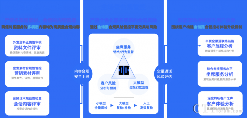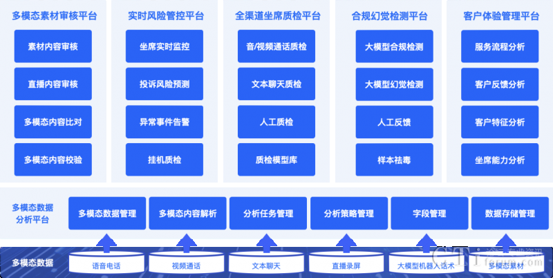 依托多項AI能力融合應用,升級后的【多模態(tài)合規(guī)分析平臺】能處理對話數據、圖片、音頻和視頻等各種格式的信息,同時采用大小模型組合式AI合規(guī)檢查機制,對各個渠道的客戶互動數據進行聚合分析,實現(xiàn)大模型構成坐席和客戶間全場景多模態(tài)數據檢測與分析,以及客戶體驗升級。