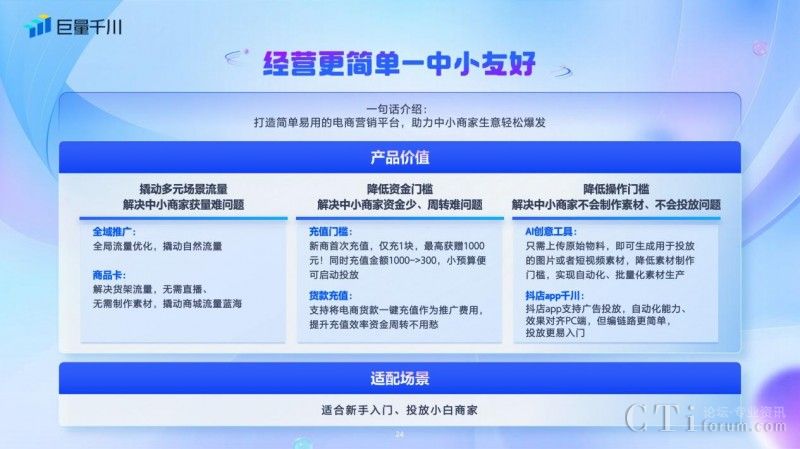 針對(duì)中小商家經(jīng)營長效問題,巨量千川打造簡(jiǎn)單易用的電商營銷平臺(tái)。撬動(dòng)多元場(chǎng)景流量,解決中小商家獲量難題;降低資金門檻,解決資金少、周轉(zhuǎn)難的問題;降低素材制作操作門檻,解決商家“不會(huì)投”、“不敢投”的難題,讓經(jīng)營更簡(jiǎn)單。