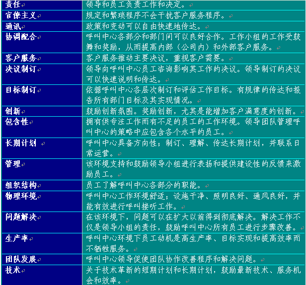 附錄6提供了建議的員工滿意度調查表。可以作為準備制訂呼叫中心使用的版本的起點。在制訂表格時,應從所有中心最佳實踐工作和領導團隊確認的其他部門取得評估要素。表格6總結了呼叫中心員工滿意度調查應包含的主要方面:
