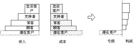 科特勒根據客戶的忠誠度給了我們一個階梯,這是客戶關系管理工作的良好參照,同時也可作為客戶關系管理工作考核的工具。我們將這個階梯做如下改造:每個層次的寬度是此級次客戶的數量,每個層次的高度是此級次客戶給企業(yè)帶來的收入,我們可以得到一個企業(yè)收入客戶分布結構圖,如右圖所示: 從圖中可以很清楚的看出客戶管理工作的內容:層次寬度(每個層次客戶的數量)和層次的高度(每個層次客戶的平均贏利水平)。 |