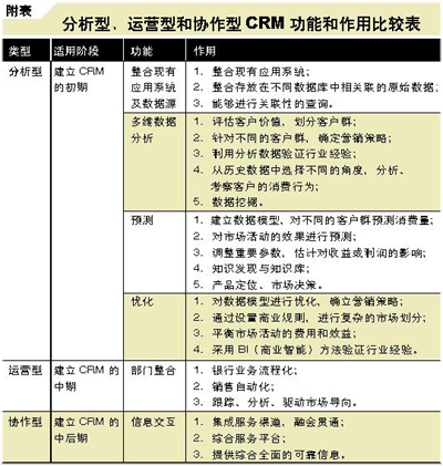 在上述目標下,有什么類型的產(chǎn)品可供選擇呢?對銀行來說,有分析型、運營型和協(xié)作型3類CRM,而這3類CRM也有著很大差別,對于有不同需求的銀行需要有不同的選擇。下面詳細分析這3類CRM。