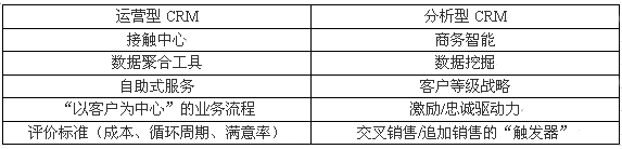 一般情況下CRM的可分為兩大類:即運(yùn)營型CRM和分析型CRM。(有時(shí)把"協(xié)作型CRM"單獨(dú)作為一類)。多數(shù)情況之下運(yùn)營型CRM引用的是產(chǎn)品,服務(wù)和一個(gè)企業(yè)實(shí)際能夠"照料"客戶的運(yùn)做能力。關(guān)系中心,數(shù)據(jù)集合系統(tǒng)及Web站點(diǎn)僅僅是一些例子。分析型CRM主要指用來推動"以客戶為中心"的戰(zhàn)略和工具。商務(wù)智能系統(tǒng),數(shù)據(jù)挖掘工具及客戶層級戰(zhàn)略都可以算在這個(gè)范疇之內(nèi)。