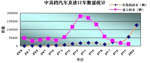 第三階段:1999年以后的快速增長階段。1999年中高檔汽車產銷量結束了六年的徘徊局面,首次突破5萬輛,比上年增長了1.5倍,在轎車市場中的占有率升到9.7%。2000年中高檔汽車的產量又實現翻倍,增長率為232.46%,年產量達到127,676臺。進口中高檔汽車數量也超過了3萬臺,僅日本車的進口量就達23,502臺。