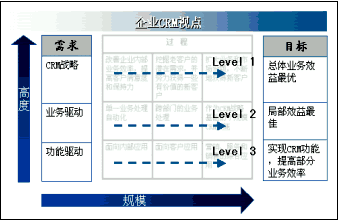 從全球CRM最佳實踐來看,企業(yè)實施CRM不外乎CRM軟件功能驅動、業(yè)務驅動和客戶關系戰(zhàn)略驅動三種情況。所以,實施CRM的視點也有三種,如下圖所示:一是,從CRM產品功能角度,根據(jù)產品所能提供的功能,選擇自己需要實施的CRM內容。這種視點充其量只能夠讓企業(yè)擁有部分CRM的功能,有限地提高部分業(yè)務處理的效率。二是,從業(yè)務角度出發(fā),通過局部優(yōu)化業(yè)務流程,實施CRM。在項目中所涉及的業(yè)務流程可能要貫穿多個CRM功能模塊。這種視點解決了一部分業(yè)務問題,它主要以流程效益或部門效益最優(yōu)為目標。三是,從企業(yè)CRM戰(zhàn)略角度出發(fā),從總體、全局、發(fā)展的高度規(guī)劃和實施CRM。CRM戰(zhàn)略驅動視點不僅追求局部效益最優(yōu),而且能夠實現(xiàn)企業(yè)總體業(yè)務效益的最大化。雖然,企業(yè)可以根據(jù)自身客戶關系管理的實際情況選擇CRM視點的高度,但是在絕大多數(shù)企業(yè)的實踐中,都會選擇CRM戰(zhàn)略高度作為著眼點,規(guī)劃企業(yè)客戶關系管理。