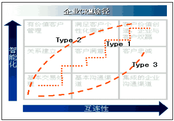 1是"小步快跑"型,Type 2是"改革優(yōu)先"型,Type 3是"技術驅動"型,如下圖所示。圖中互連性,表示企業(yè)信息化環(huán)境建設的規(guī)模,也意味著企業(yè)與客戶的交互程度,即溝通能力;縱坐標所示的智能化,代表管理思想、管理模式、知識應用和情感投入,是客戶關系管理中人性化和價值衡量的雙重體現(xiàn)。