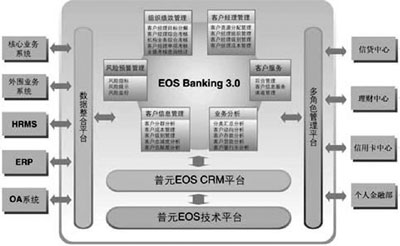 普元公司順應中國銀行業(yè)發(fā)展的趨勢,綜合國內外金融業(yè)的市場營銷和管理模型,把具有世界級水平的EOS平臺推廣到銀行業(yè),提供具有中國特色的“EOS銀行客戶經理管理系統(tǒng)”。這套系統(tǒng)可以幫助銀行快速組織資源,面向客戶提升客戶服務、市場營銷水平,同時對客戶經理的業(yè)績考核加強管理,為客戶經理提供風險控制工具,為營銷主管部門決策提供支持。最終實現(xiàn)幫助銀行達到提高利潤、降低成本,提高銀行客戶滿意度及提高市場占有率的管理目標。