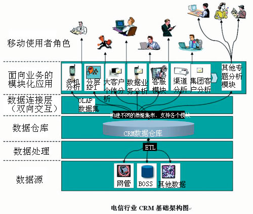 電信行業(yè)早期的CRM系統(tǒng)主要是由單一的多維分析子系統(tǒng)組成,比如移動總公司最早的CRM系統(tǒng)就僅僅規(guī)范了以多維分析為標(biāo)準(zhǔn)的九大主題分析。隨著移動電信市場的迅速增長,復(fù)雜程度越來越高,更多的子系統(tǒng)被添加進來,IT系統(tǒng)建設(shè)中模塊化的思路通過數(shù)據(jù)集市的方式在CRM建設(shè)中體現(xiàn)明顯。