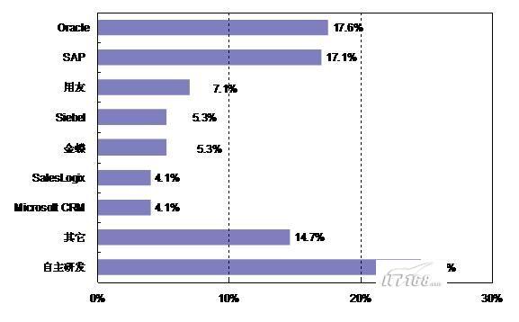 。。 在開展了CRM系統(tǒng)應用的企業(yè)中,CRM系統(tǒng)品牌認知率最高的是ORACLE和SAP,分別占17.6%和17.1%;其他品牌還有用友(7.1%)、Siebel(5.3%)、金碟(5.3%)、Sales Logix(4.1%)和Microsoft CRM(4.1%)等;另有24.7%的企業(yè)是自主開發(fā)的CRM系統(tǒng)。