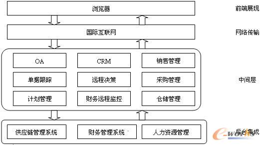 中間層:是實(shí)現(xiàn)具體的應(yīng)用功能的層次,包括銷售、采購、倉儲(chǔ)管理、遠(yuǎn)程審批/監(jiān)控/決策等;
