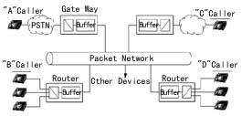 網(wǎng)關(guān)或路由器內(nèi)部的語音編碼器對(duì)帶內(nèi)音頻信號(hào)進(jìn)行打包和重組。這些器件對(duì)確認(rèn)接收和有效數(shù)據(jù)包接收的順序進(jìn)行糾錯(cuò)檢查。一旦發(fā)現(xiàn)錯(cuò)誤,將命令重發(fā),而重發(fā)相關(guān)數(shù)據(jù)包則不可避免地造成傳輸上的延時(shí)。網(wǎng)關(guān)或路由器上的緩存器