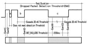 圖5所示的是丟包測(cè)試的時(shí)序圖, 圖中的語音路由測(cè)試信號(hào)即為“Golden Voice”產(chǎn)生的復(fù)合語音信號(hào)。在測(cè)試中,用戶可以自行設(shè)定分別為5ms、10ms、15ms、25ms、50ms或100ms檢測(cè)門限值。