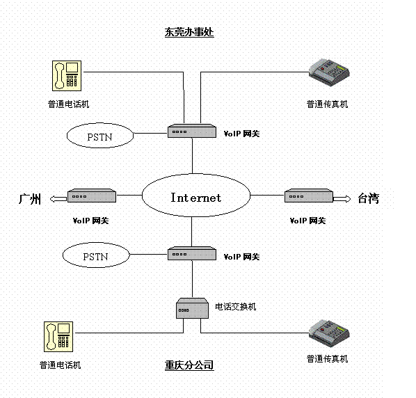 有一家臺商公司,在臺灣、東莞、廣州和重慶自己的分支機(jī)構(gòu),相互之間有大量的通話聯(lián)系,特別是研發(fā)部門,其通話量更是非常大。因此試圖在各個地方之間使用IP電話來降低通訊支出。在實(shí)施IP電話服務(wù)之前,各個地方都擁有完善的局域網(wǎng),并且申請了固定IP的寬帶接入。并且在辦公室內(nèi)部署了程控電話交換機(jī)。