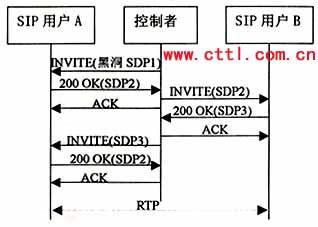 該流程中,控制者首先向用戶A發(fā)送INVITE,包含SDP1,用來創(chuàng)建一個初始的“黑洞”媒體流,A振鈴并產(chǎn)生應答記為SDP2,其中包含的是一個有效的連接地址,但此時仍沒有媒體流向控制者?刂普呦駻發(fā)出ACK。
