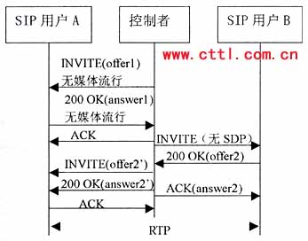 控制者再向B發(fā)送一個沒有SDP的INVITE。B應答的200 0K響應中包含一個提供offer2,控制者應該基于offer2向A發(fā)送一個re-INVITE,注意。offer2可能需要稍作修改來滿足媒體要求。例如如果offer1包含一個音頻和一個視頻行,而offer2只有一個音頻行,控制者就需要在offer2中增加一個視頻行(端口設為O)來構(gòu)成offer2’。由于這是一個re-INVITE,所以通常應該能立即收到響應。A的200
