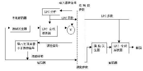 為了說明問題,考慮人的聲道產(chǎn)生的一個語音模式:當(dāng)人說話產(chǎn)生語音信號時就會發(fā)出濁音(如音素pa、da等)和清音(如音素sh、th)。激勵信號就是由輸入的語音信號導(dǎo)出的,其方法是使合成語音與輸入語音的差別非常小。LPC的用法、激勵的產(chǎn)生以及對合成分析(AbS)系統(tǒng)的誤差檢查均如圖4-1所示。