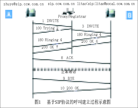 在Windows中內(nèi)置的NetMeeting就是典型的H.323協(xié)議客戶端,而比較常見(jiàn)的SIP系統(tǒng)是微軟開(kāi)發(fā)的MSN Messenger系統(tǒng)。一個(gè)簡(jiǎn)單的SIP協(xié)議呼叫建立過(guò)程如圖1所示。