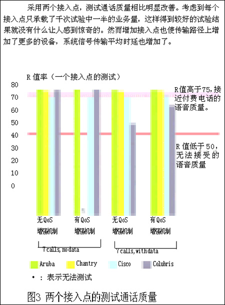 但我們這樣做是合理的。首先,Chantry和Colubris的設(shè)備甚至在建議內(nèi)的6個(gè)并行VoIP呼叫情況下,也無法正常通話。第二,Aruba的設(shè)備能夠處理7個(gè)并行VoIP呼叫并能適應(yīng)加入數(shù)據(jù)流業(yè)務(wù)的情況。第三,我們最有難度的試驗(yàn)也遠(yuǎn)低于無線傳輸媒介的最大負(fù)載。我們試驗(yàn)通常低于3Mbps的通信傳輸速度(包括試驗(yàn)中的所有語音和數(shù)據(jù)業(yè)務(wù)),更遠(yuǎn)低于無線信道的容量了?傊琕oWLAN系統(tǒng)可以實(shí)現(xiàn)在單接入點(diǎn)承載7個(gè)并行VoIP呼叫并加入數(shù)據(jù)通信業(yè)務(wù),但要做到這一點(diǎn)需要更完善的系統(tǒng)設(shè)計(jì)和產(chǎn)品性能。