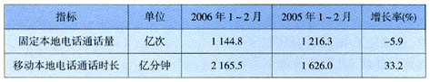 表1 2006年1-2月固定市話(huà)與移動(dòng)市話(huà)通話(huà)量