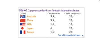 套餐2(BusinessBroadbandVoiceLine Olny):免費(fèi)接入(通常需要40英鎊),每月5英鎊,本地及國內(nèi)通話資費(fèi)3.5便士/分鐘,第一個(gè)小時(shí)通話資費(fèi)10便士封頂;撥打手機(jī)通話優(yōu)惠,1小時(shí)通話資費(fèi)封頂25便士;國際通話優(yōu)惠,不同流向國家的1小時(shí)通話資費(fèi)封頂10或20便士,如圖3所示。