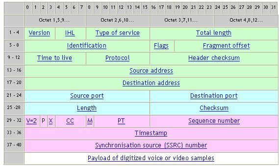根據(jù)IETF的標(biāo)準(zhǔn)建議,通過IP網(wǎng)絡(luò)傳輸語音信號樣本需要增加三個額外的報(bào)頭,每個報(bào)頭對應(yīng)一個網(wǎng)絡(luò)層次,即IP,UDP和RTP [4]。