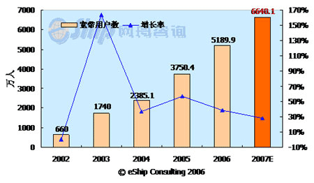 從圖中可以看出,中國的寬帶用戶數(shù)保持了快速的發(fā)展勢頭,從2002-2007年年均增長率為58.7%,至2007年,國內(nèi)的寬帶用戶數(shù)將達到6640.1萬。