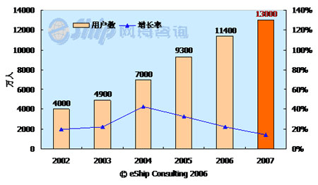 從圖中可以看出,國內(nèi)即時通訊用戶數(shù)保持了較快的發(fā)展速度,從2002-2006年年均增長率為26.6%,到2007年國內(nèi)即時通訊用戶數(shù)將達到1.3億。