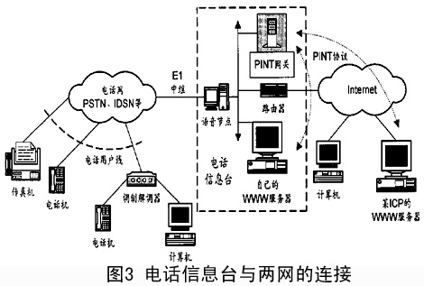 ---- 由 于PINT 業(yè) 務(wù) 主 要 是 以WWW 方 式 實 現(xiàn) 的, 因 此 電 話 信 息 臺 就 應(yīng) 與ICP 合 作, 如 圖3, 在 兩 者 之 間 以 一 種 標 準 的 協(xié) 議 交 換 信 令 和 承 載 數(shù) 據(jù),PINT 協(xié) 議 正 是 一 種 很 合 適 的 協(xié) 議。 為 了 實 現(xiàn) 點 擊 撥 號、 點 擊 發(fā) 送 傳 真 等 業(yè) 務(wù), 需 要 在WWW 服 務(wù) 器 的 頁 面 上 嵌 入 激 活 這 些 業(yè) 務(wù) 的 鏈 接 項, 鏈 接 項 對 應(yīng) 的 后 臺 程 序 是 一 個PINT 客 戶 端 程 序(PINT Client),PINT 網(wǎng) 關(guān) 中 也 具 有PINT Client 的 功 能。PINT Client 包 含 了UAC 和UAS 的 功 能。 在 這 類 業(yè) 務(wù) 的 推 廣 初 期, 由 于PINT 網(wǎng) 關(guān) 較 少, 作 為WWW 服 務(wù) 器 后 臺 程 序 的PINT Client 可 直 接 與PINT 網(wǎng) 關(guān) 交 互。 當(dāng) 業(yè) 務(wù) 使 用 規(guī) 模 進 一 步 擴 大 后 就 需 要 在Internet 中 設(shè) 置PINT Server, 各PINT Client 借 助 于 這 些PINT Server 來 找 到 一 個 合 適 的PINT 網(wǎng) 關(guān)。 如 果 電 話 信 息 臺 自 身 提 供 了ICP 的 功 能, 那 么 在 信 息 臺 內(nèi) 部 的 局 域 網(wǎng) 上 就 可 以 方 便 地 實 現(xiàn) 業(yè) 務(wù)。