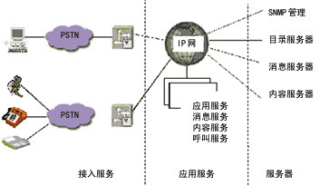 數(shù)據(jù)交換技術的發(fā)展使IP逐漸成為數(shù)字、語音等各種信息服務的網(wǎng)絡基礎標準。各種基于IP傳送話音、視頻的技術標準(如SGCP、VoIP等)也不斷提出并迅速統(tǒng)一。那么,基于IP的統(tǒng)一消息方案由兩部分組成:通用信息接收箱功能模塊和通用連接手段。通用信息接收箱功能模塊用于把所有形式的消息,如傳真、話音郵件、電子郵件等集成到一個IP網(wǎng)上的通用接收箱,用來提供給用戶一個公共平臺,來管理所有的消息。通用連接手段允許用戶通過電話網(wǎng)、DSL網(wǎng)、有線電視網(wǎng)和無線網(wǎng),使用電話、PC、電子郵件客戶設備、Web瀏覽器、無線手持設備和PDA訪問通用信息接收箱。