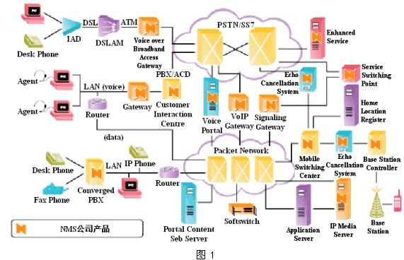 其具體技術(shù)內(nèi)容包括:語(yǔ)音IP (VoIP)、語(yǔ)音DSL (VoDSL)和語(yǔ)音無線本地環(huán)路(VoWLL);以及用于確保IP語(yǔ)音、視頻和數(shù)據(jù)通信性能的其他技術(shù)。圖1顯示了NMS公司的產(chǎn)品在整個(gè)通信應(yīng)用(包含PSTN網(wǎng)絡(luò)和IP分組網(wǎng)絡(luò))中的位置。