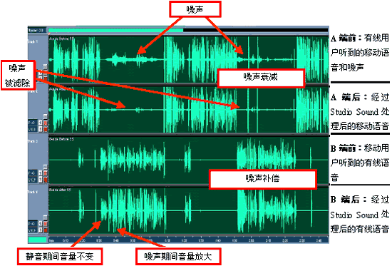 這里的結(jié)果顯示出,PSTN側(cè)收聽(tīng)器接收到的噪音是如何被大大降低的,同時(shí)PSTN側(cè)說(shuō)話的音量在無(wú)線側(cè)出現(xiàn)大聲的噪音期間被顯著地放大了。通過(guò)遍及全球的類似場(chǎng)合試驗(yàn),在應(yīng)用Studio Sound之前和應(yīng)用之后通話質(zhì)量的不同已經(jīng)深刻為許多業(yè)務(wù)提供商所了解。