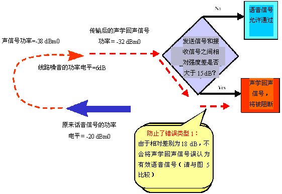 然而,如果判斷過程是根據功率電平的相對差異來進行的(而不是絕對差異),測量結果將更為準確。通過在靜音期間測量兩個傳輸方向上的線路功率電平,就能得知相對的功率電平差異。使用在靜音期間獲得的信息,在分類信號前(即決定信號是聲學回聲還是有效語音),對呼叫兩端的功率電平差異進行修正,就能更加準確地了解相對信號強度。該方法稱為智能語音檢測,它能顯著降?quot;錯誤類型1"出現(xiàn)的可能性,如圖9所示。注意,在分析該方法時,請比對圖5和圖9。