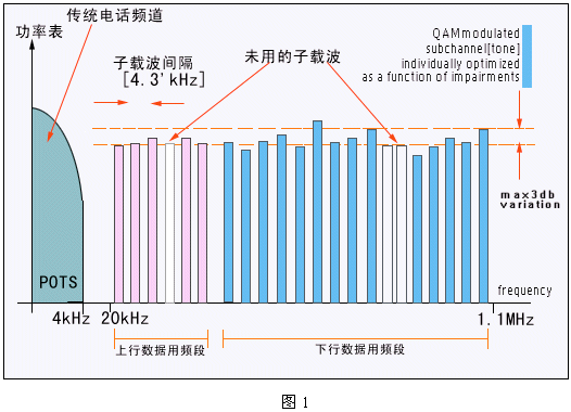 DSL技術(shù)是在人們對(duì)高速互聯(lián)網(wǎng)訪問需求推動(dòng)下的產(chǎn)物。DSL利用頻率復(fù)用和OFDM調(diào)制技術(shù),在不影響傳統(tǒng)電話業(yè)務(wù)的前提下可以為用戶提供最高達(dá)8Mbps的數(shù)據(jù)傳輸速率。這個(gè)速率是基于POTS的Modem速率(以目前的最高速率56kbps為參考)的140倍;DSL技術(shù)所帶來的巨大帶寬為家庭和小型公司提供了一個(gè)寬帶數(shù)字業(yè)務(wù)的新平臺(tái)。這個(gè)DSL平臺(tái)可以支持多種寬帶業(yè)務(wù):包括高速Internet接入、虛擬專網(wǎng)及VOD等流媒體業(yè)務(wù)。其基本原理如下圖1所示:
