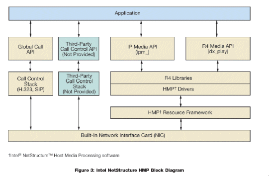 HMP軟件結(jié)構(gòu)與Dialogic Dialogic 板卡DM3結(jié)構(gòu)同樣的方式, 但不需要專門的硬件。
